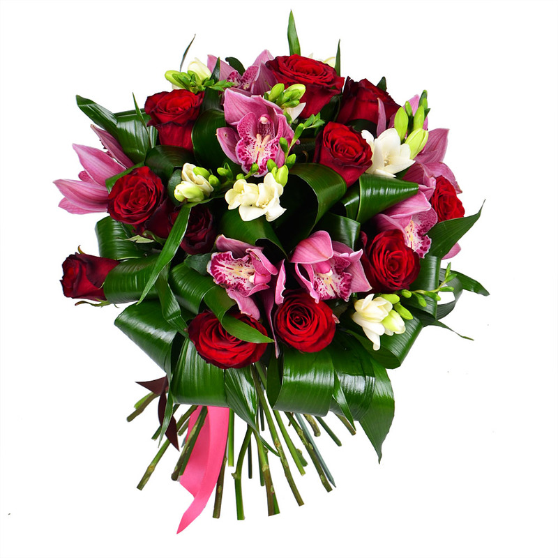Букет собран из великолепных алых роз, белых фрезий, нежно-розовых орхидей, и все это великолепие расположилось на зеленой подушке аспидистры. Эту очаровательную композицию можно и нужно дарить всем представительницам прекрасного пола!