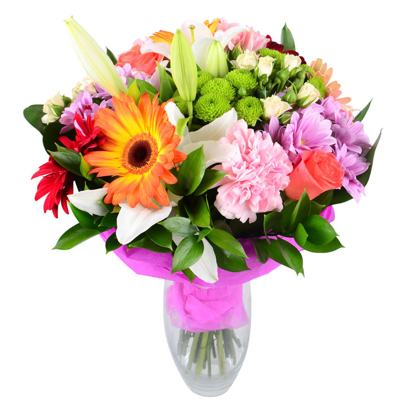 Это настоящий цветочный бум из роз, лилий, гвоздик, гербер, хризантем! Такой презент порадует июльскую именинницу и августовскую кокетку, ведь в нем собраны все краски этого чудного времени года.