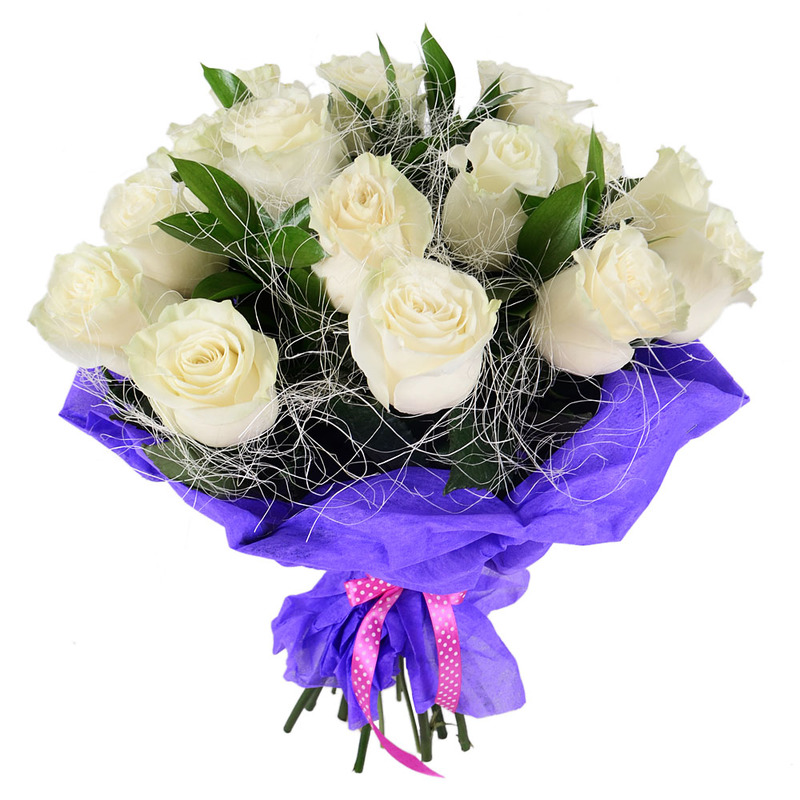 Роза белая (15 шт.), Зелень (2 шт.), Декоративные элементы (1 шт.), Лента (1 шт.), Упаковка (1 шт.).