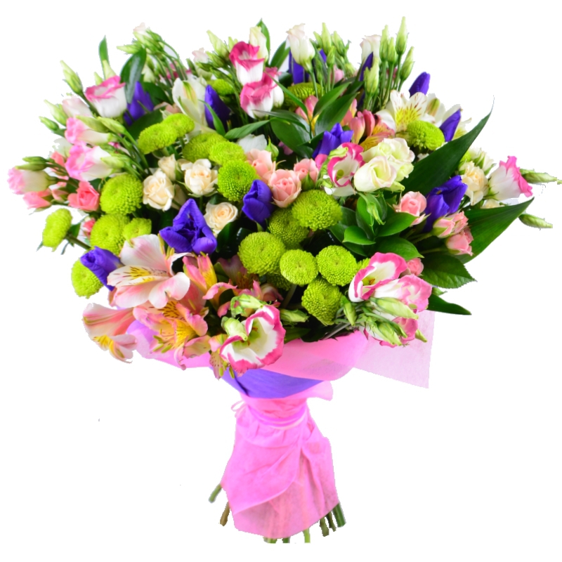 Альстромерия розовая (5 шт.), Ирис фиолетовый (11 шт.), Роза кустовая кремовая (4 шт.), Хризантема зелёная (5 шт.), Эустома розовая (8 шт.), Зелень (1 шт.), Лента (1 шт.), Упаковка (2 шт.).