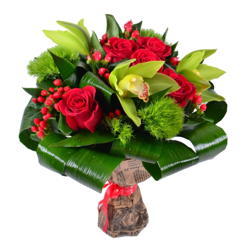 Состав: Гвоздика зелёная (3 шт.), Орхидея зелёная (3 шт.), Роза красная (5 шт.), Гиперикум красный (4 шт.), Зелень (1 шт.), Лента (1 шт.), Упаковка (1 шт.).