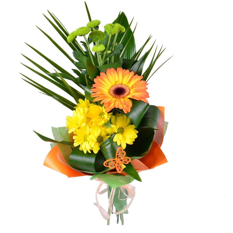 Состав: Гербера оранжевая (1 шт.), Хризантема жёлтая (1 шт.), Хризантема зелёная (1 шт.), Аспидистра (1 шт.), Феникс (1 шт.), Декоративные элементы (1 шт.), Лента (1 шт.), Упаковка (1 шт.).