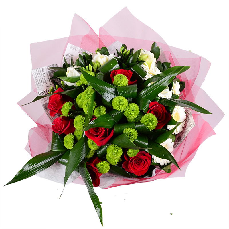 Состав: Гербера белая (5 шт.), Роза красная (7 шт.), Фрезия белая (7 шт.), Хризантема зелёная (4 шт.), Аспидистра (10 шт.), Лента (1 шт.), Упаковка (1 шт.)