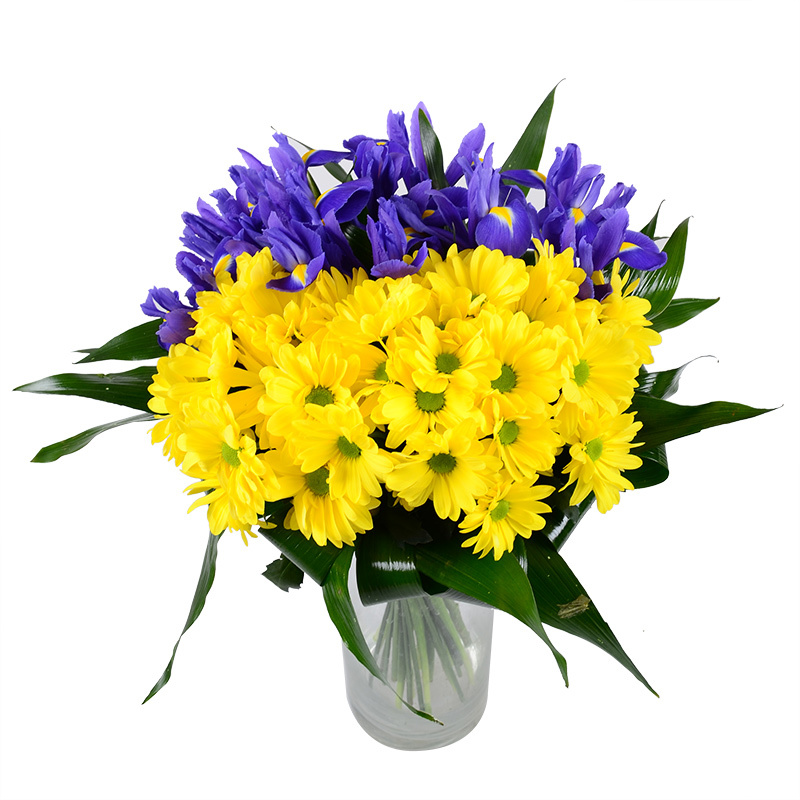 Роскошное море синих ирисов в сочетании с желтыми ромашковыми хризантемами– лучший вариант подарка для творческих девушек. Эта композиция волнует своим ароматом и завораживает красотой лепестков.