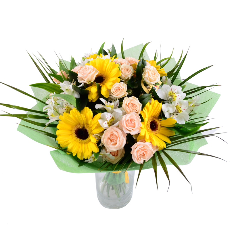 Альстромерия белая (5 шт.), Гербера жёлтая (5 шт.), Роза кустовая кремовая (5 шт.), Зелень (1 шт.), Феникс (1 шт.), Упаковка (1 шт.).