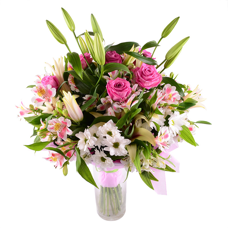 Состав: Альстромерия розовая (10 шт.), Лилия белая (3 шт.), Роза розовая (7 шт.), Хризантема ромашковая белая (5 шт.), Лента (1 шт.), Упаковка (1 шт.).