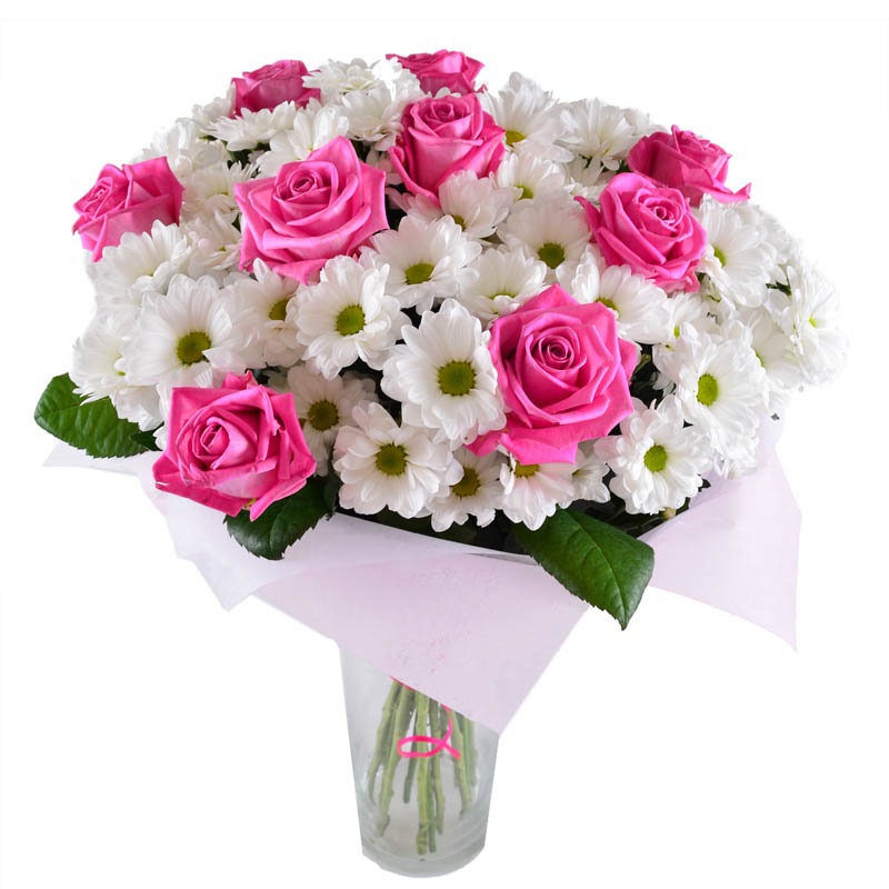 Этот букетиз легкого облака белых ромашковых хризантем с изысканными розовыми розами. Подарок станет отличным украшением Дня Влюбленных, годовщины, Дня Рождения, 8 Марта для девушки или жены.