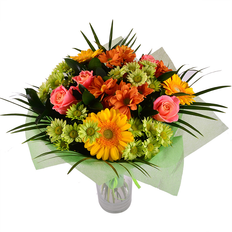 Этот букет переливается яркими красками лета! Только взгляните на эту пеструю гамму: здесь и коралловые розы, и желтые герберы, и зеленые хризантемы. Он просто создан поднимать настроение!