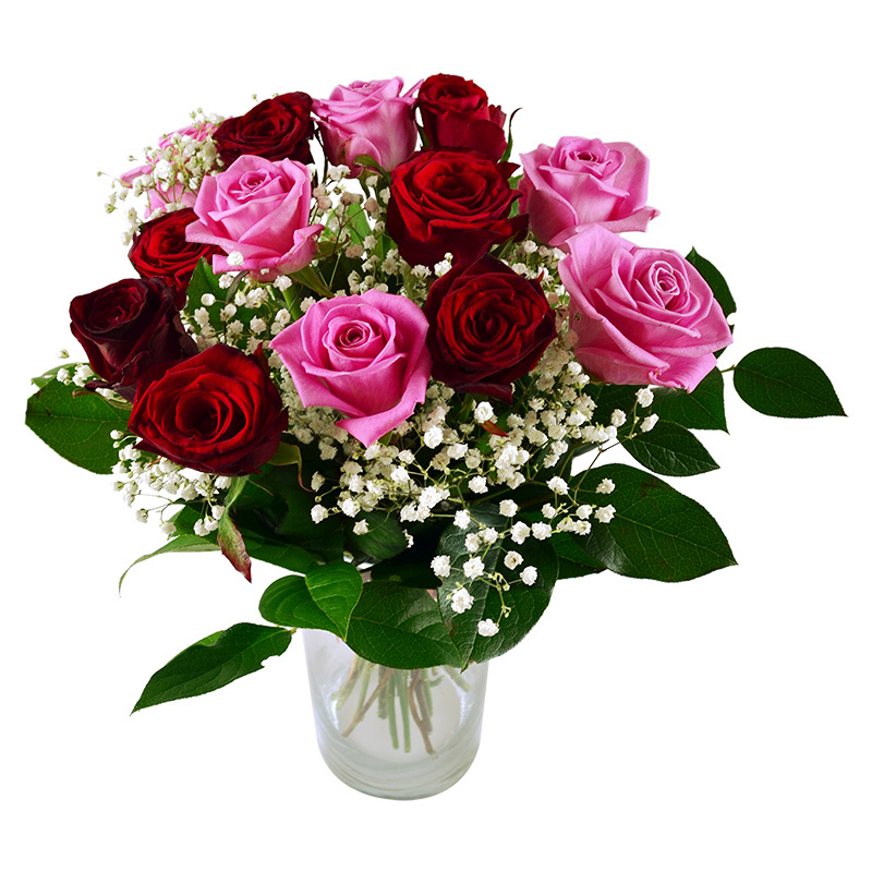 Состав : Роза премиум красная и розовая (13 шт.), зелень, упаковка.