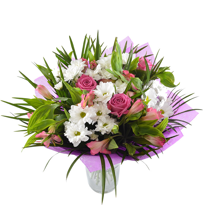 "Соседи" в букете подобраны таким образом, чтобы выразить получательнице восхищение и восторг. Такие значения на языке цветов имеют розовые розы и белые хризантемы. Изящное кружево лепестков альстромерий рассветного цвета дарит букету пышность и гармонию. Такой роскошный презент можно заказать для дам любого возраста, ведь розовая гамма — это воплощение женственности. Лучшие поводы — День рождения, День Влюбленных, 8 Марта, юбилей и, конечно же, День Матери.