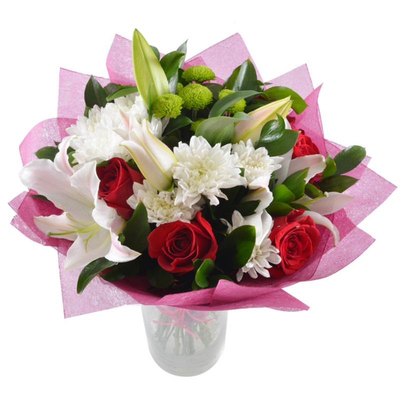 Состав: Лилия (1 шт.), роза красная (5 шт.), кустовая хризантема (3 шт.), зелень, упаковка (1 шт.).
