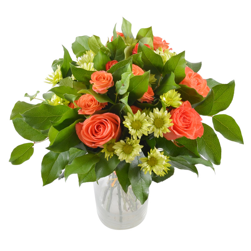 Оранжевые розы и изумруды зеленых хризантем в этом букете дополняют и оттеняют друг друга.