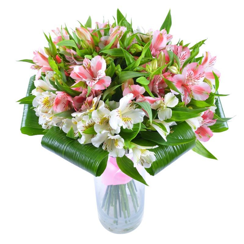 Нежная композиция из белой и розовой альстромерии, хрупкие цветочки которой уютно устроились на крупных темных листьях аспидистры, сразу обращает на себя внимание.