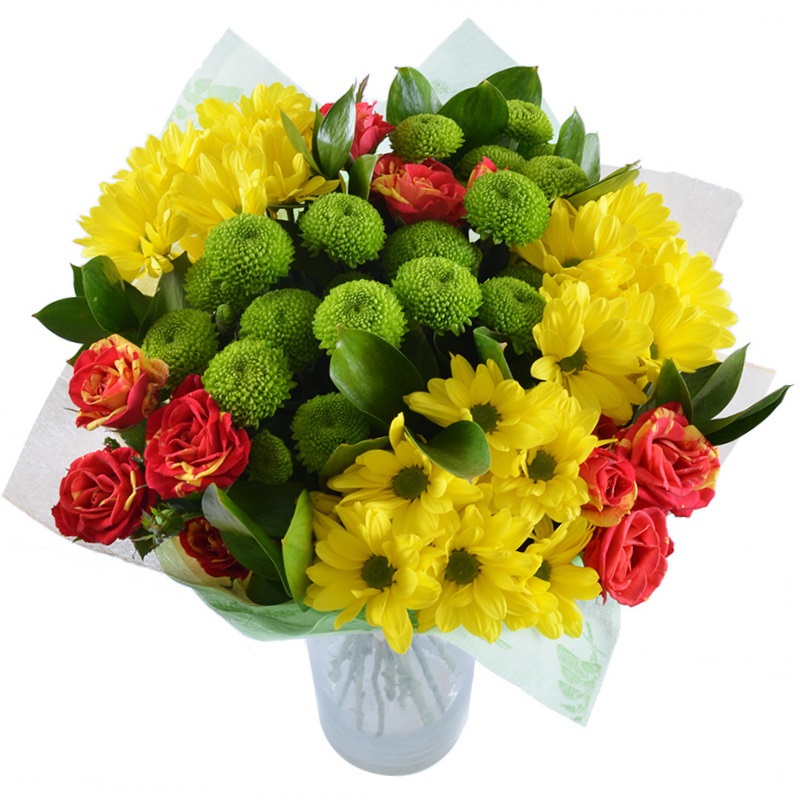 Одного взгляда на этот жизнерадостный букет достаточно, чтобы настроение улучшилось, а на губах появилась счастливая улыбка. Прелестное сочетание алых кустовых роз, ярко-желтых ромашковых и зеленых хризантем сантини способно творить чудеса.