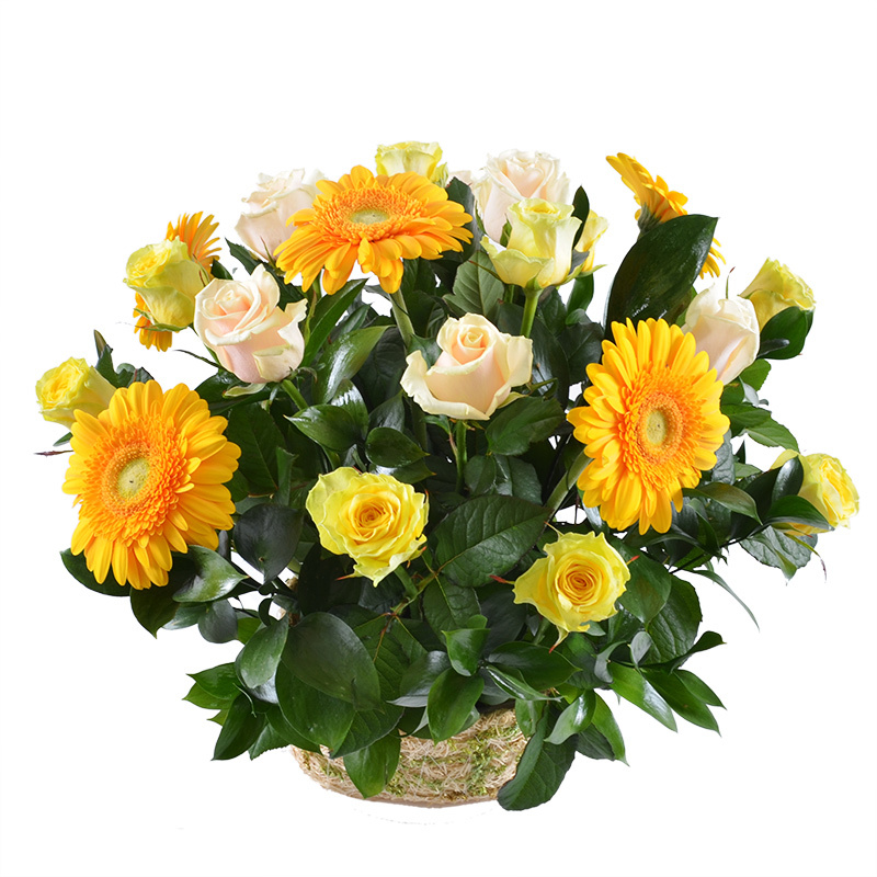 Корзина состоит из свежих цветов желтых оттенков. Крупные канареечного цвета герберы выделяются своей броской красотой. Рядом с ними изящные золотистые розы с яркой серединкой приобретают сочный лимонный оттенок. Нежные кремовые бутоны дополняют картину из чудесных цветов, наполненных энергией и цветом солнца. Каждый лепесток четко проступает на фоне роскошной, блестящей изумрудом зелени.