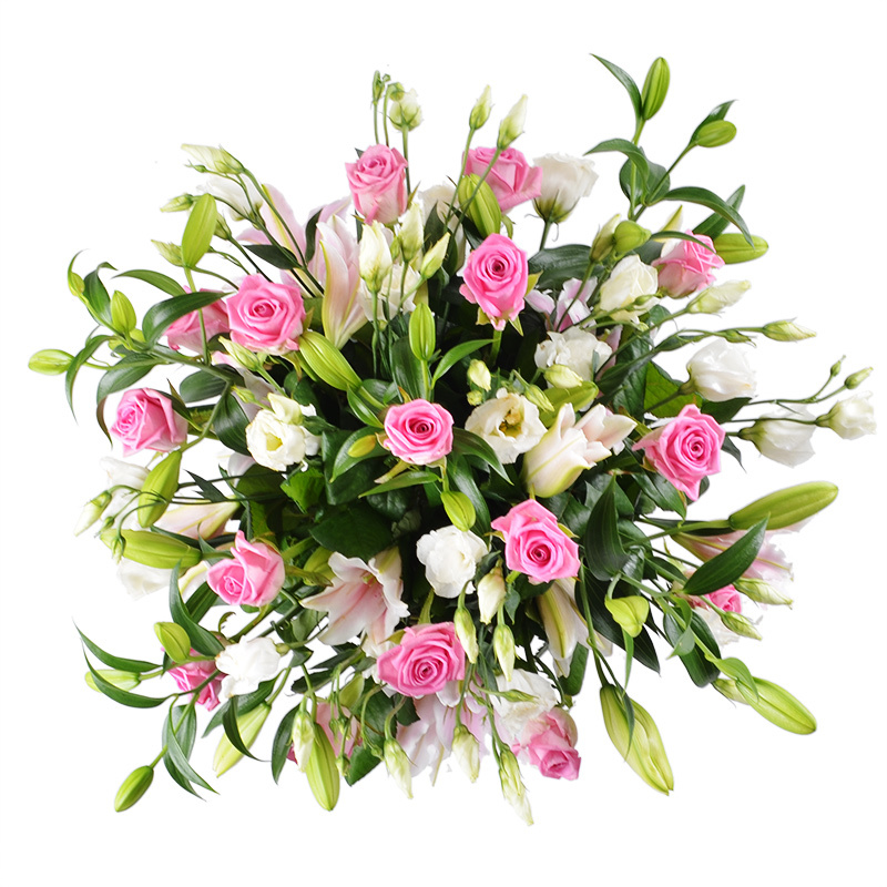 Состав: Лилия (5 шт.), роза (15 шт.), эустома (7 шт.), зелень, упаковка (1 шт.).
