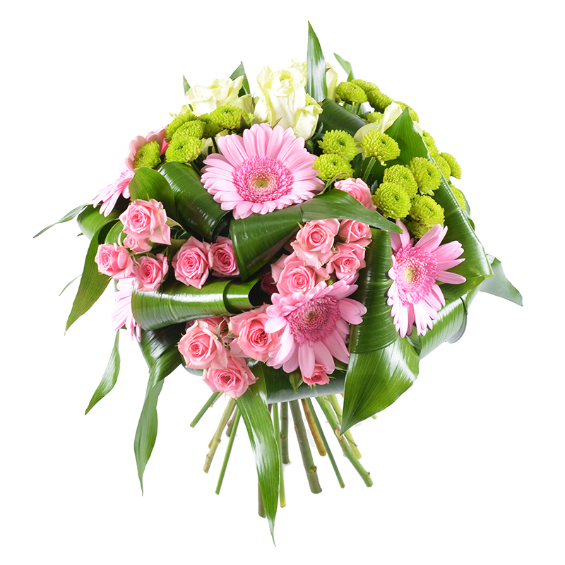 Этот небольшой, но такой милый букет, составлен из розовых гербер и кустовых роз, салатовых хризантем и белой розы (премиум). Цветы жизнеутверждающих насыщенных тонов уютно расположились в декоративном «гнездышке».