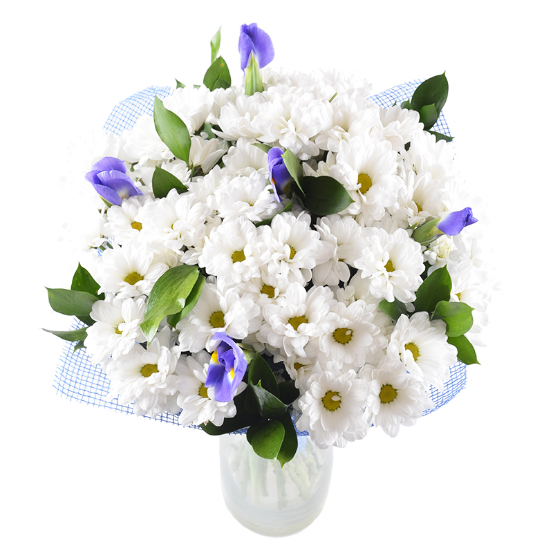 Светлая, легкая композиция из белых ромашковых хризантем с ирисами. Нежность и наивность очаровательных цветов не может не вызвать улыбку и самые приятные чувства.