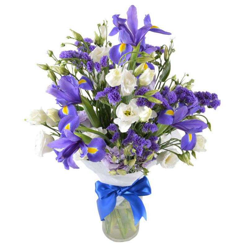 Состав: Ирис синий (10 шт), Эустома белая (5шт.), зелень (1 шт.)