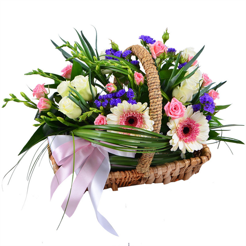 Состав: Гербера розовая (2 шт.), Роза белая (7 шт.), Роза кустовая розовая (2 шт.), Статица фиолетовая (2 шт.), Зелень (1 шт.), Лента (1 шт.), Оазис (1 шт.), Корзина (1 шт.).