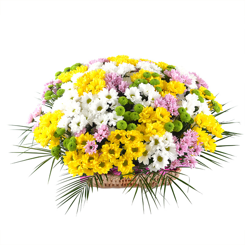 Состав: Хризантема ромашковая разноцветная (101 шт.), Оазис (1 шт.), Корзина (1 шт.).