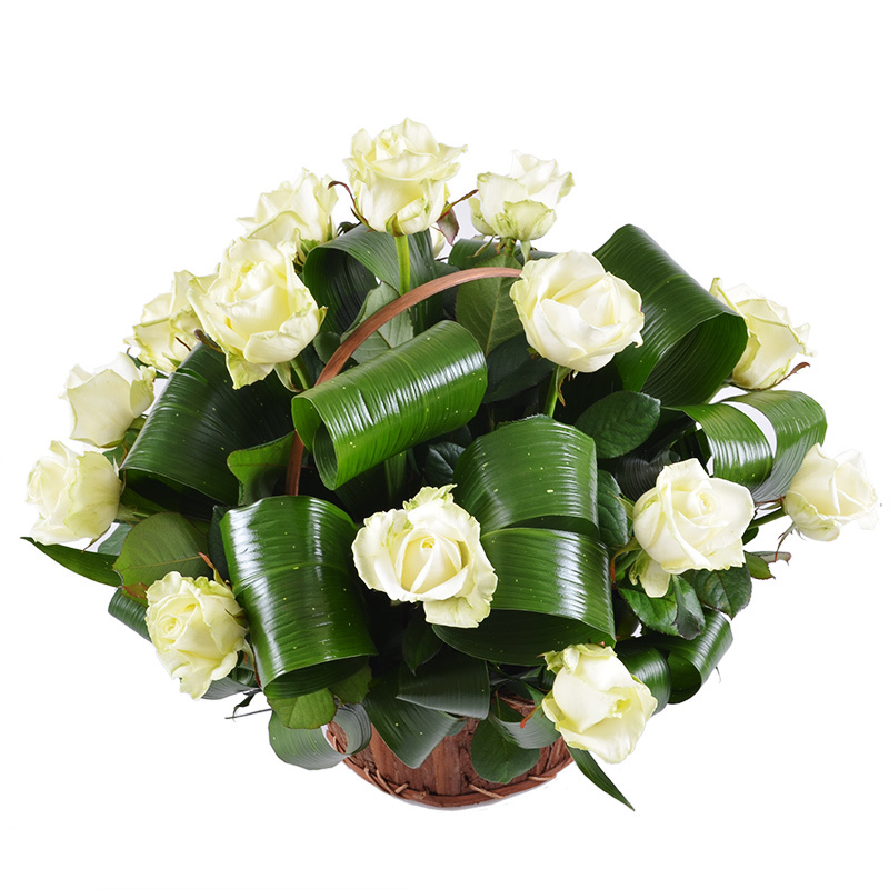 Состав: Роза белая(15 шт.), зелень аспидистры( 7 шт.), оазис (1 шт.), корзина (1 шт.).