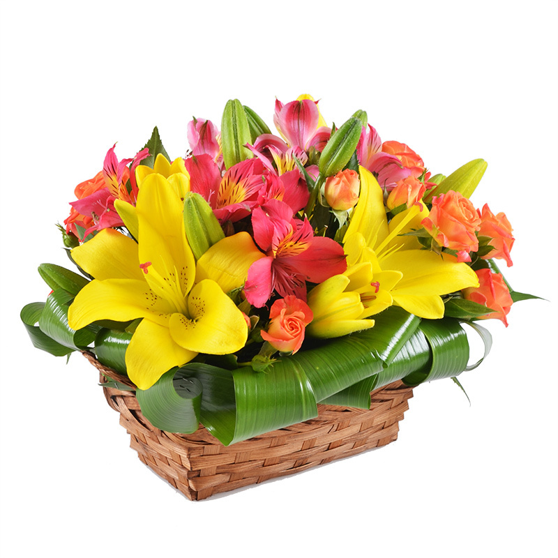 Состав: Альстромерия розовая (2 шт.), Лилия жёлтая (2 шт.), Роза кустовая розовая (3 шт.), Аспидистра (5 шт.), Зелень (1 шт.), Оазис (1 шт.), Корзина (1 шт.).