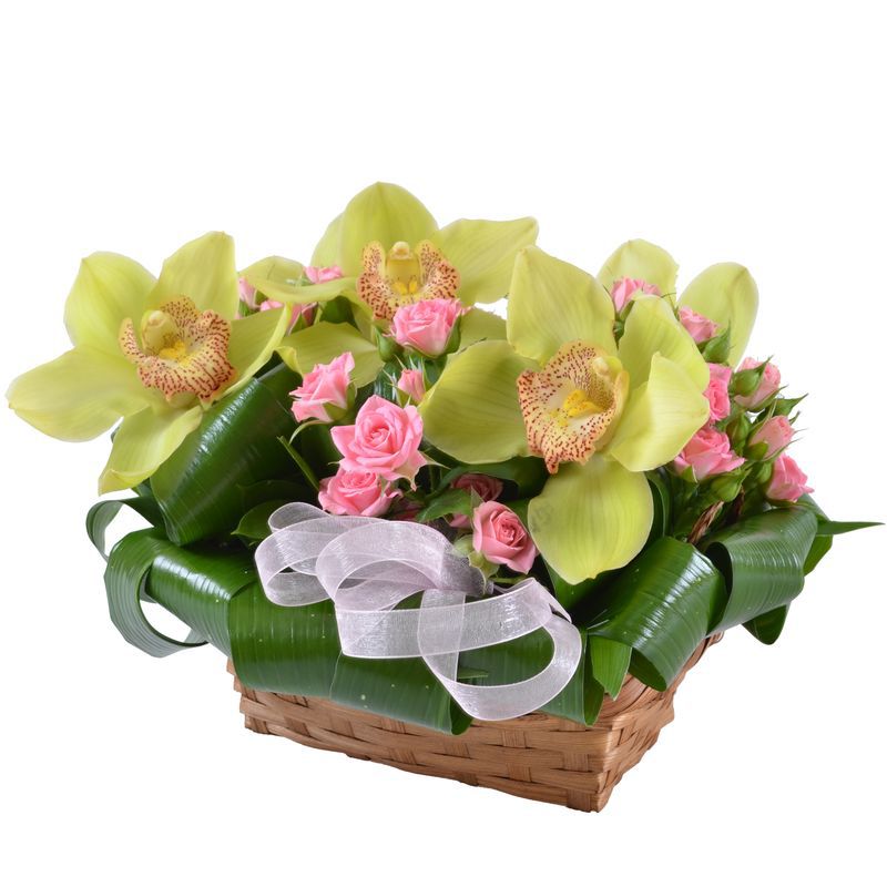 Состав: Орхидея на колбе (5 шт), роза кустовая (5 шт), зелень (5 шт), корзина (1 шт), лента (1шт.).