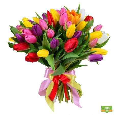 51 разноцветный тюльпан — нежное весеннее поздравление с любым праздником. Хотите удивить девушку или жену? Подарите ей полсотни тюльпанов самых разных оттенков! Они смогут легко передать всю ту гамму чувств, которая наполняет влюбленное сердце.